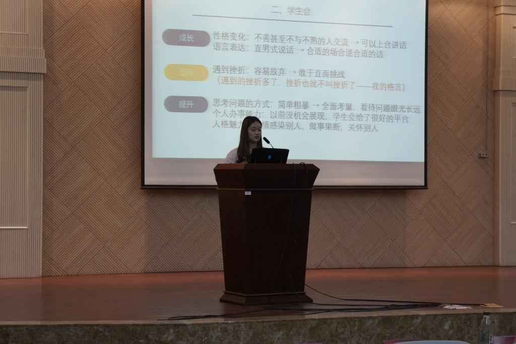 郑梓文同学分享了自己在部队的经历,让在场同学对“青春与国家”有了更深的理解;王世博同学则针对学生干部经历对于求职就业的积极影响做了分享;武星志同学就团队精神、自我认知、时间规划、换位思考四个方面进行经验交流;王一鸣同学分享了自己多重身份学生工作经历,用自己的实际行动证明了“时间挤一挤总会有”。高琴同学则鼓励在场学弟学妹多多尝试突破自我,科技创新、文艺比赛等方面各尽所长,充实自己的大学生活。