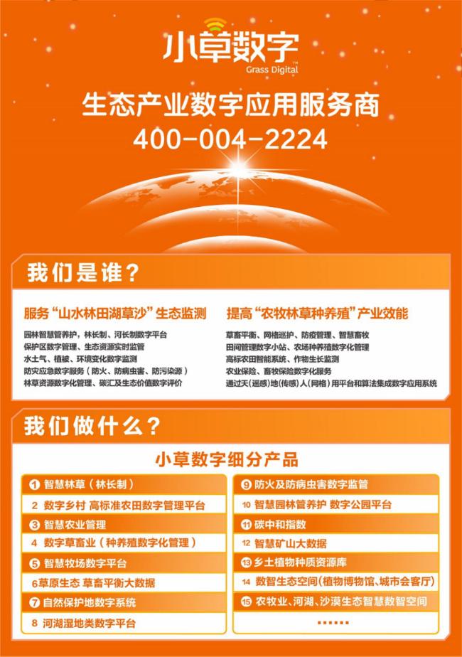 小草数字公司是生态产业数字应用服务商,服务“山水林田湖草沙”国土监测,提高“农牧林草种养殖”产业效能。是蒙草生态集团孵化的科创公司、国家高新技术企业。